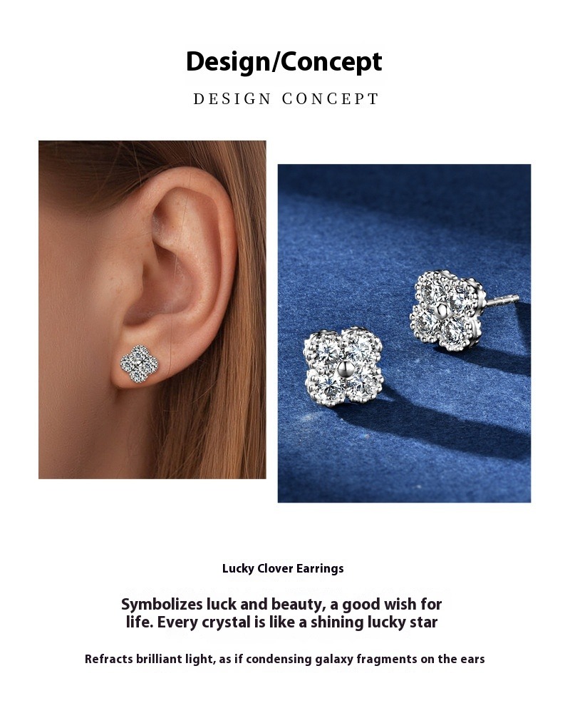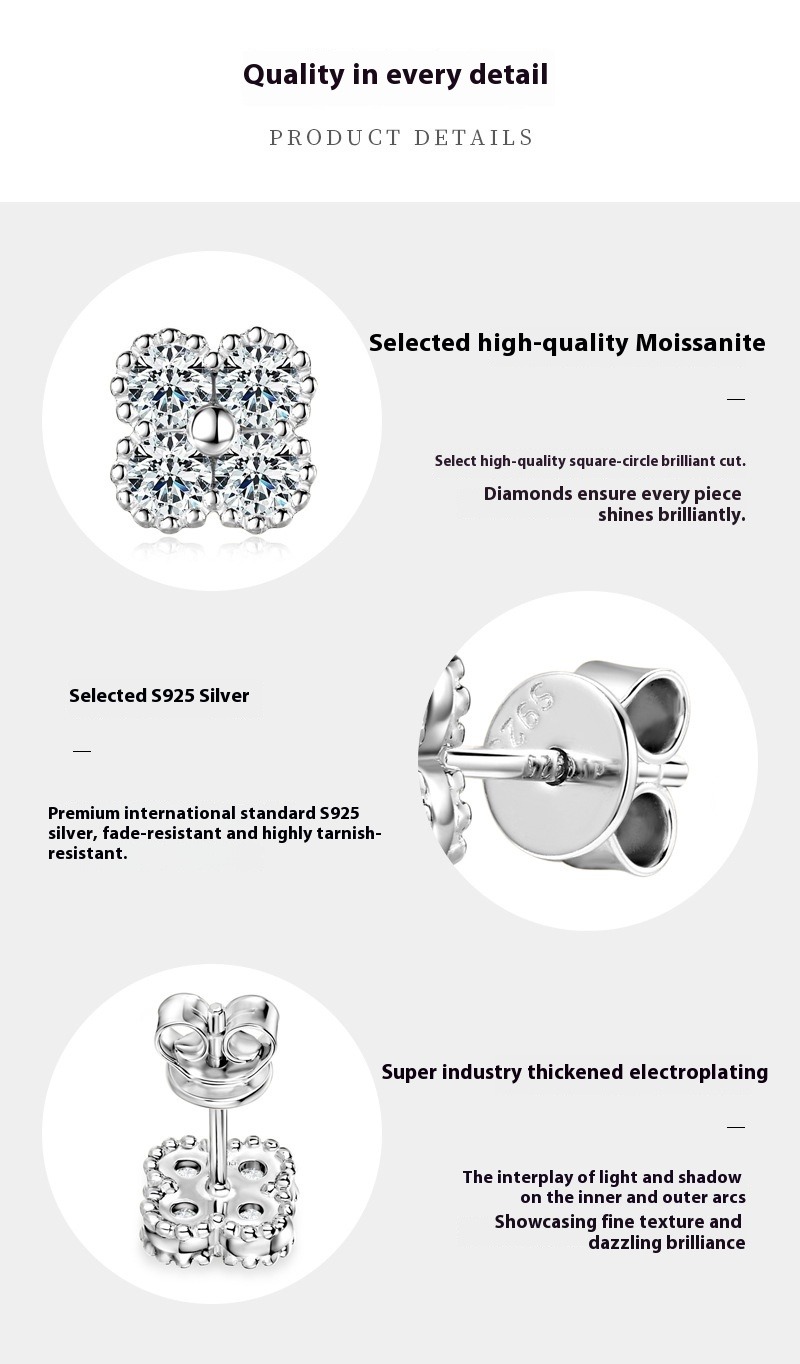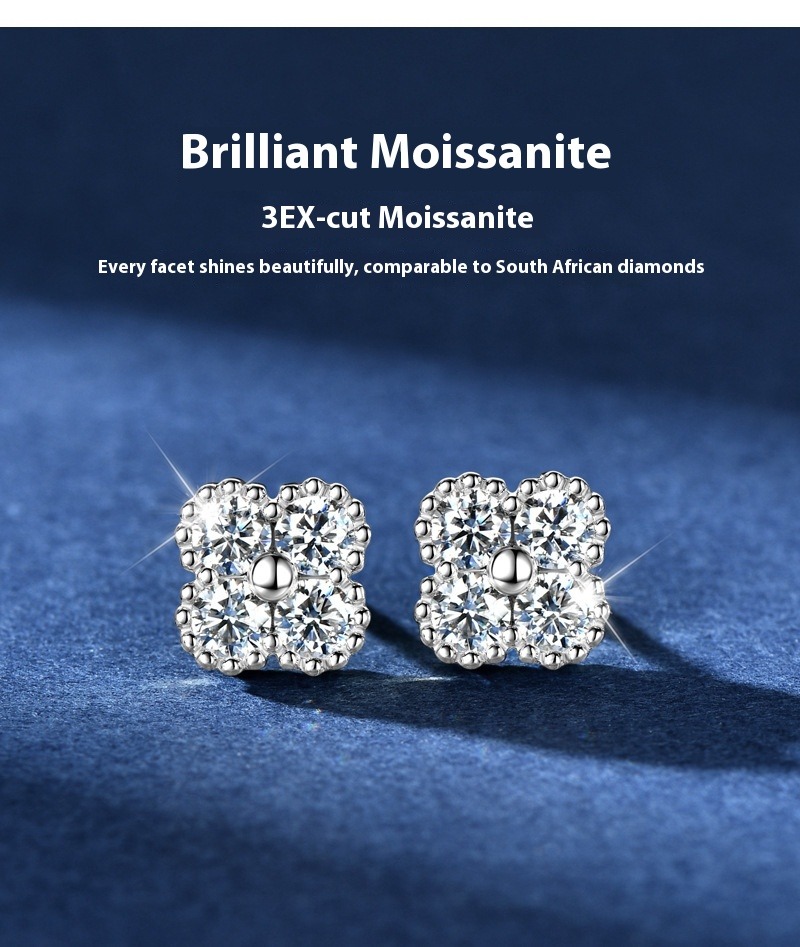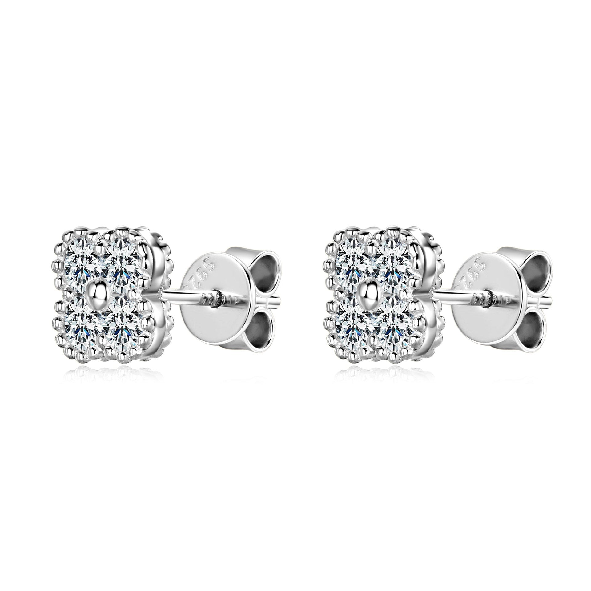 S925 Sterling Silver Four Leaf Clover Moissanite Stud Earrings - Lucky Charm Pavé Flower